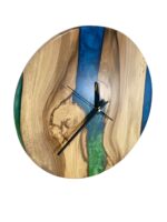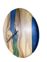 Horloge en chêne qui est complétée par de l’époxy coloré. Résine – nous utilisons une résine certifiée stable aux UV et certifiée sanitaire